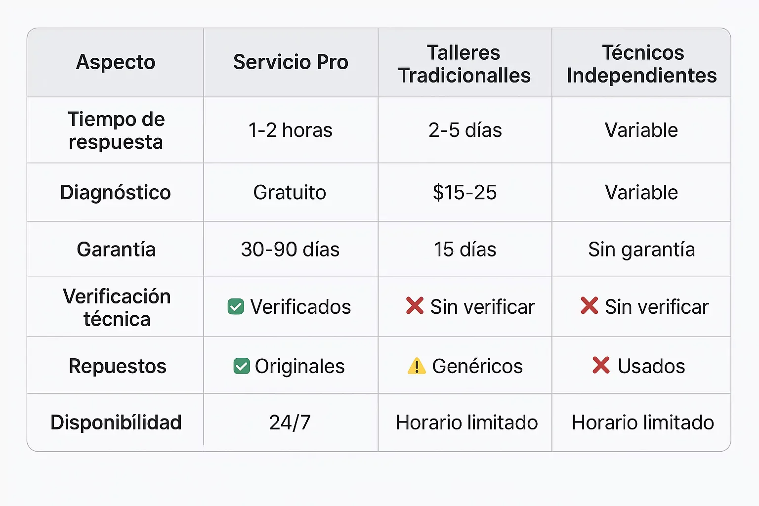 Aspecto Servicio Pro Talleres Tradicionales Técnicos Independientes Tiempo de respuesta 1-2 horas 2-5 días Variable Diagnóstico Gratuito $15-25 Variable Garantía 30-90 días 15 días Sin garantía Verificación técnica ✅ Verificados ❌ Sin verificar ❌ Sin verificar Repuestos ✅ Originales ⚠️ Genéricos ❌ Usados Disponibilidad 24/7 Horario limitado Horario limitado
